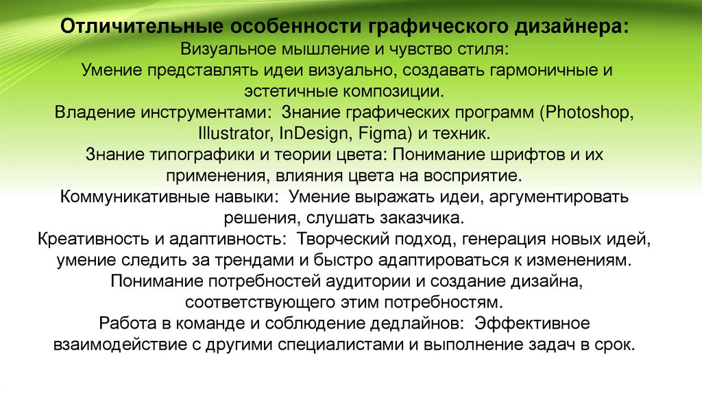 Отличительные особенности графического дизайнера:Визуальное мышление и чувство стиля: