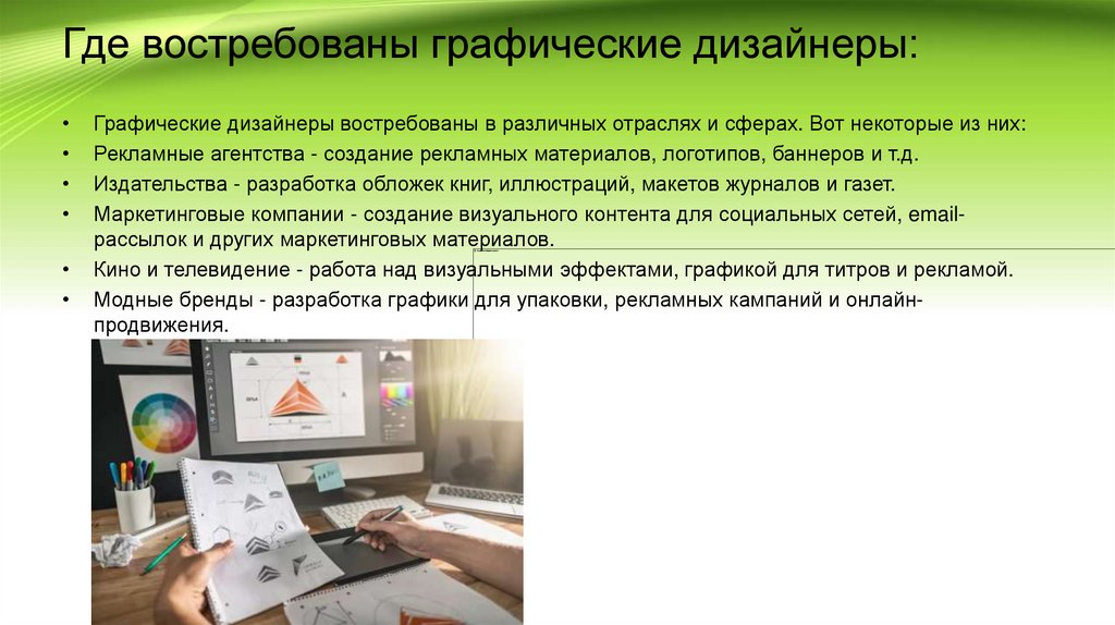 Где востребованы графические дизайнеры:Графические дизайнеры востребованы в различных отраслях и сферах. Вот некоторые из них: