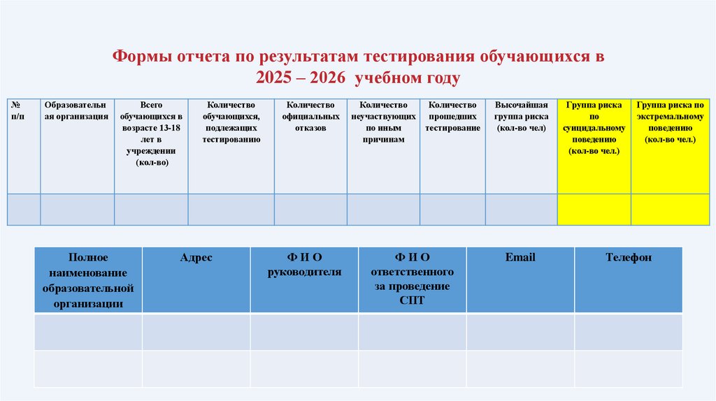 Формы отчета по результатам тестирования обучающихся в2025 – 2026 учебном году