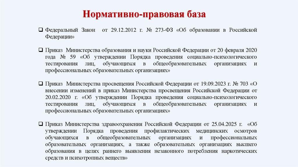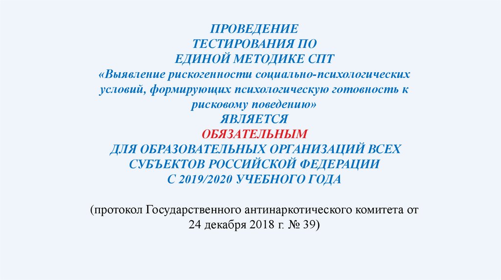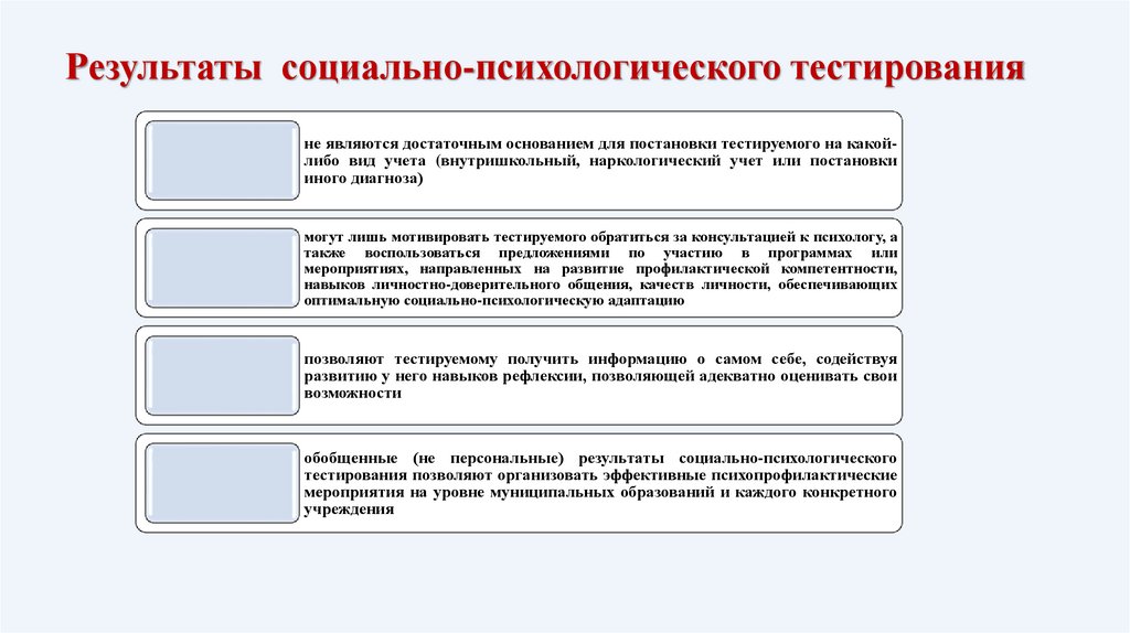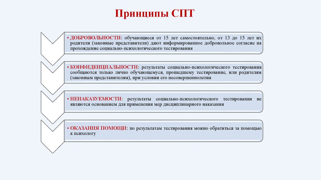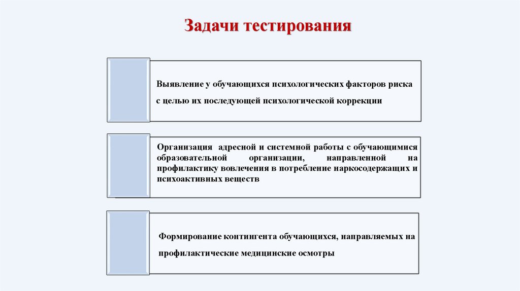 • Тестирование проводится с 13 лет, начиная с 7 класса обучения в общеобразовательной организации• Организация адресной работы по результатам тестирования является неотъемлемым элементом