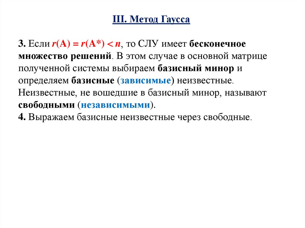 III. Метод Гаусса3. Если r(A) = r(A*) n, то СЛУ имеет бесконечное