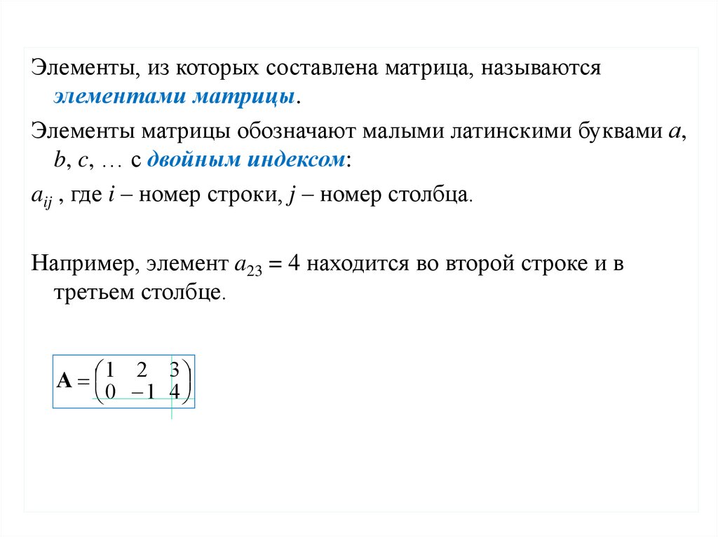 Элементы, из которых составлена матрица, называютсяэлементами матрицы.