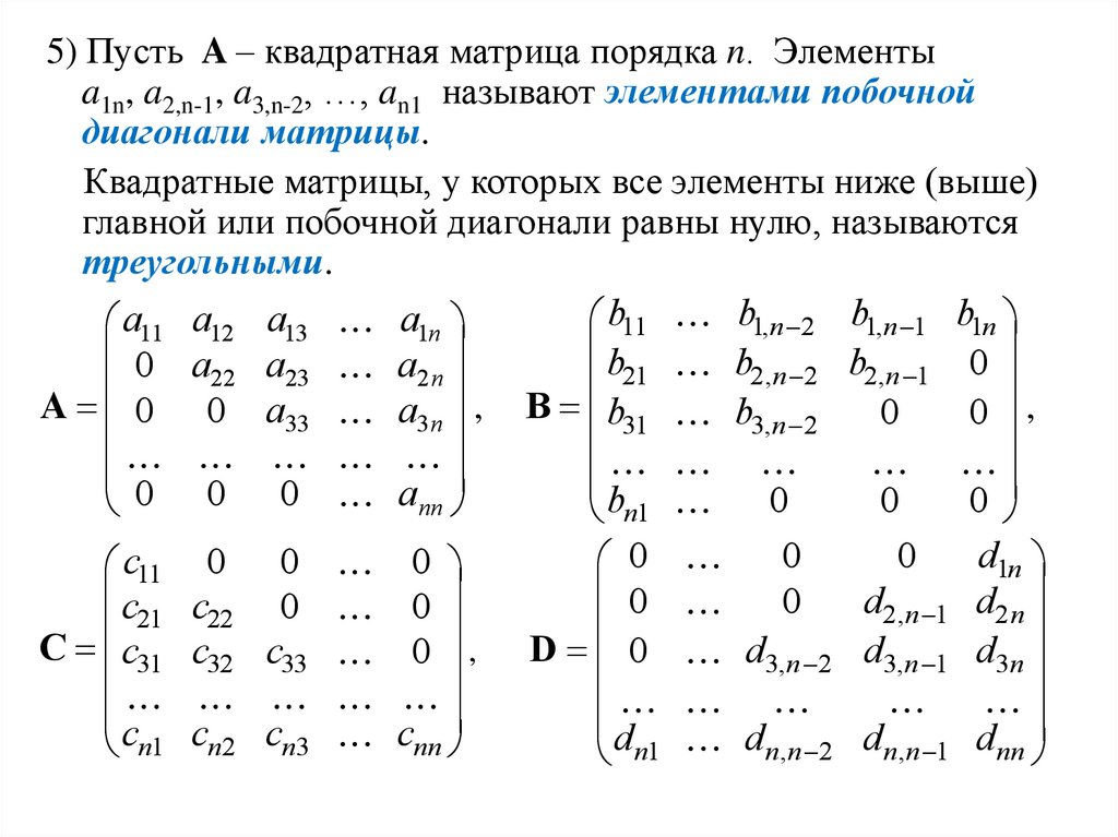 5) Пусть A – квадратная матрица порядка n. Элементыa1n, a2,n-1, a3,n-2, …, an1 называют элементами побочной