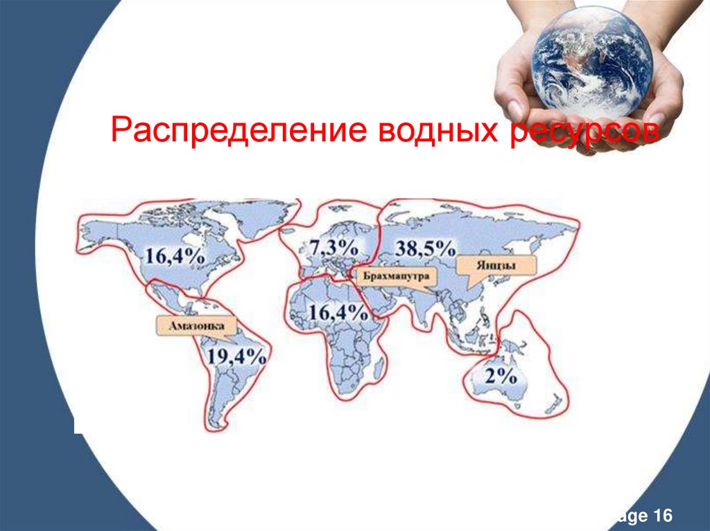 • Распределение воды в гидросфереНа пресные воды приходится около 2,5 %