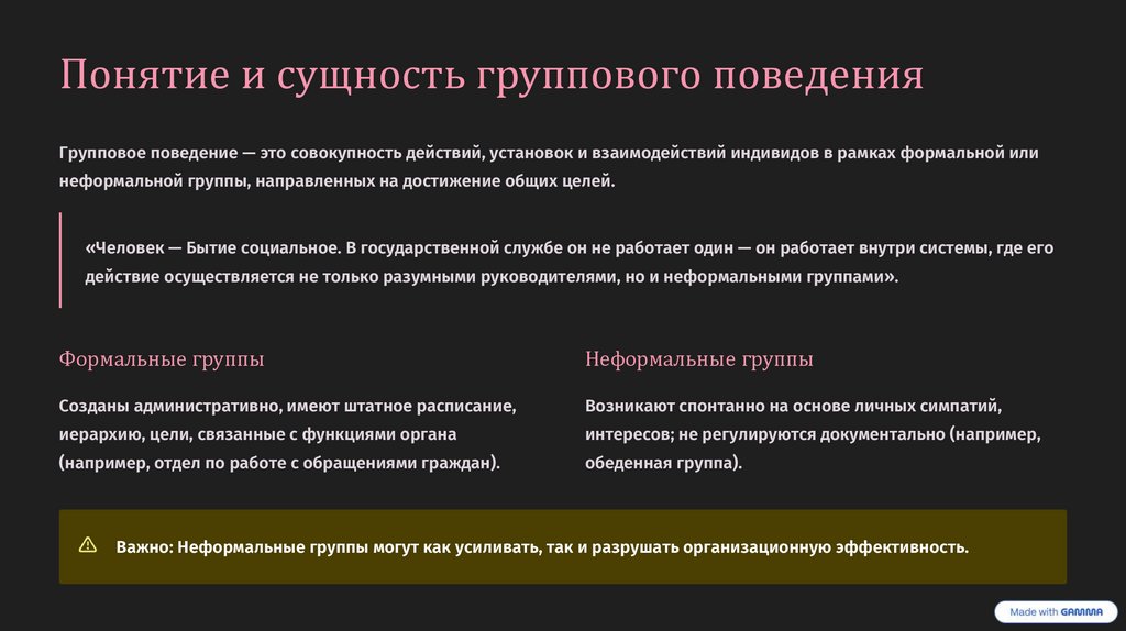 Понятие и сущность группового поведенияГрупповое поведение — это совокупность действий, установок и взаимодействий индивидов в рамках формальной или