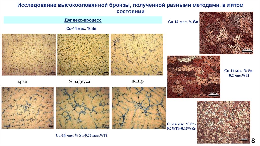 термической обработки на микроструктуру и механические свойства легированной бронзы с содержанием олова 1416 мас. %, полученной разными методами: дуплекс-процессом и Osprey-технологией.