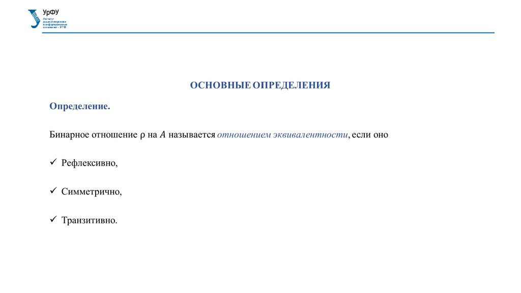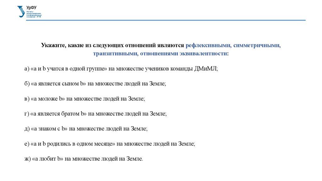 Укажите, какие из следующих отношений являются рефлексивными, симметричными,транзитивными, отношениями эквивалентности: