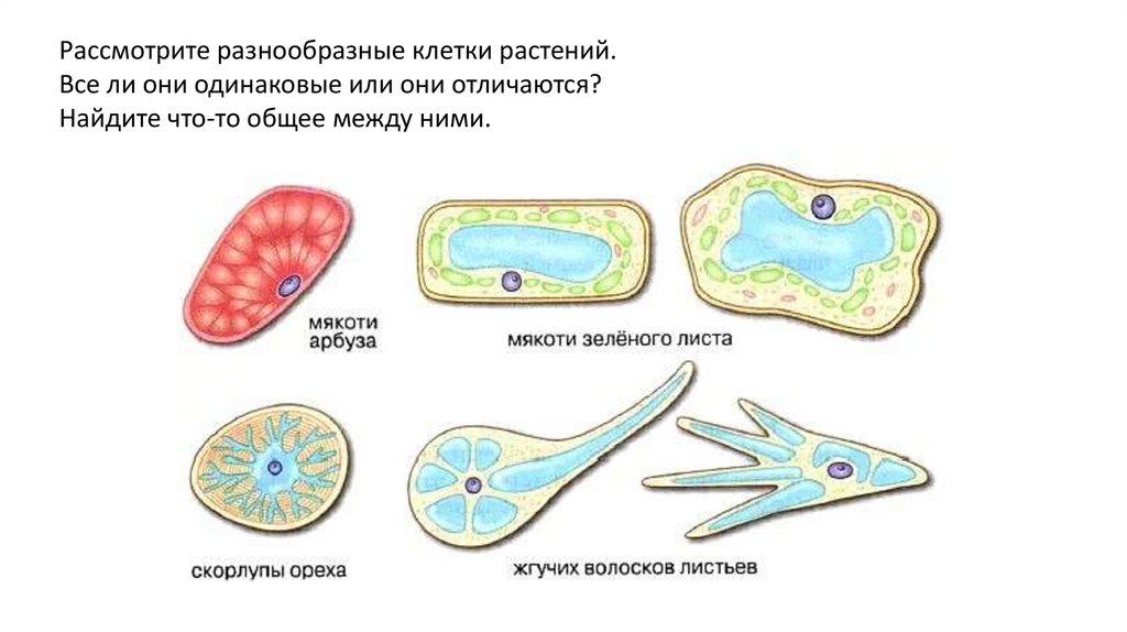 Рассмотрите разнообразные клетки растений.Все ли они одинаковые или они отличаются?