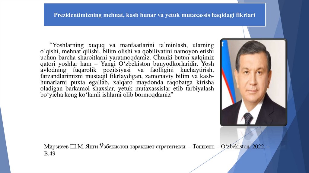 Prezidentimizning mehnat, kasb hunar va yetuk mutaxassis haqidagi fikrlari“Yoshlarning xuquq va manfaatlarini ta’minlash, ularning