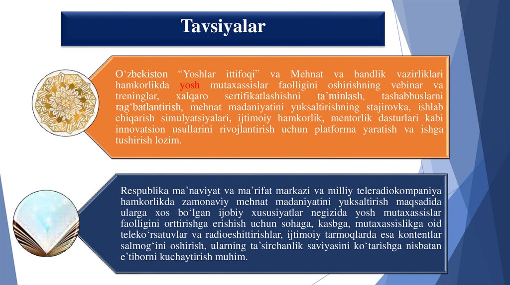 TavsiyalarO‘zbekiston “Yoshlar ittifoqi” va Mehnat va bandlik vazirliklari