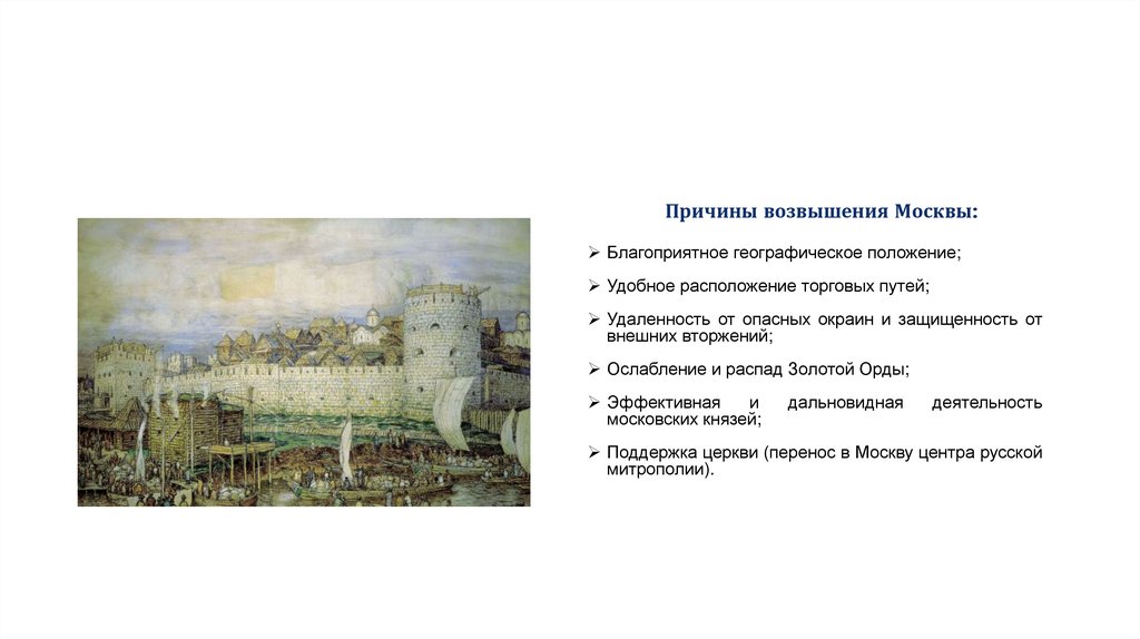 Причины возвышения Москвы:Благоприятное географическое положение;