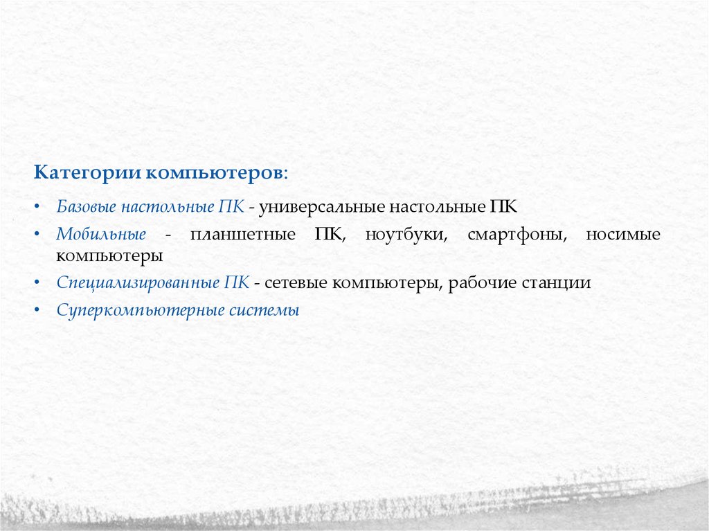 Категории компьютеров:• Базовые настольные ПК - универсальные настольные ПК
