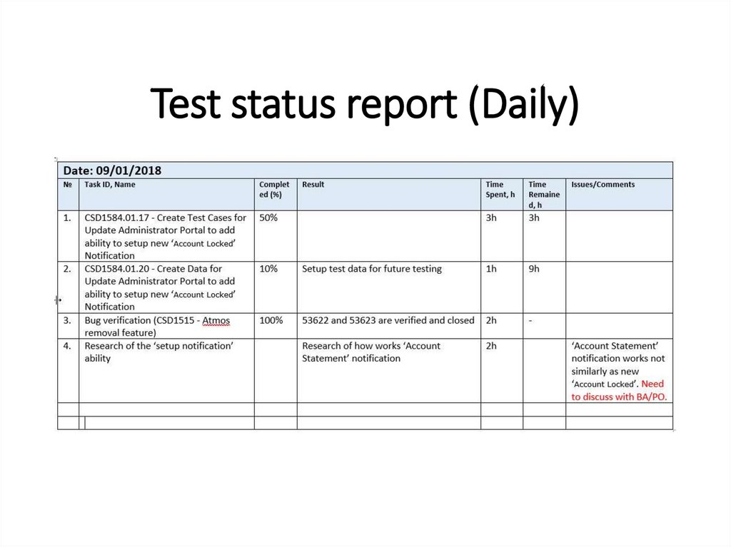 Test status report – A testing status report is a report that contains a summary of allthe testing-related activities that happened within a particular time. It highlights the
