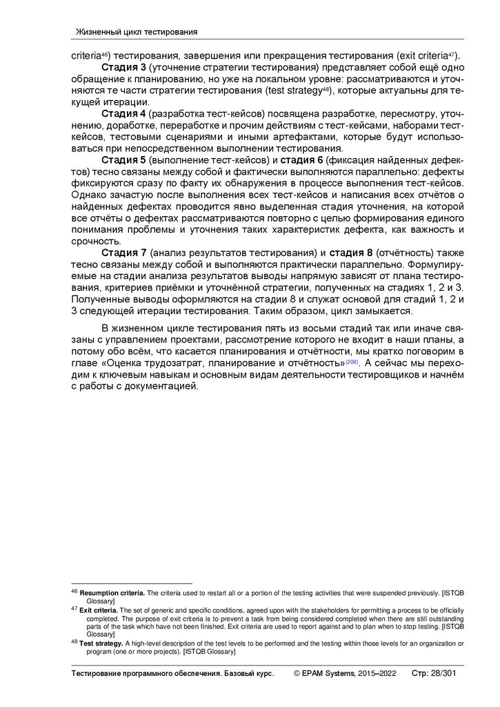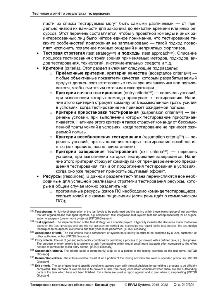 o Критерии возобновления тестирования (resumption criteria335) — перечень условий, при выполнении которых тестирование возобновляется (как правило, после приостановки).