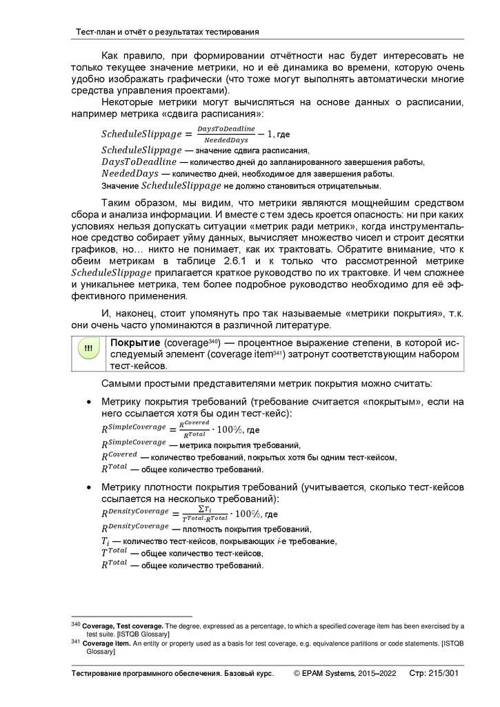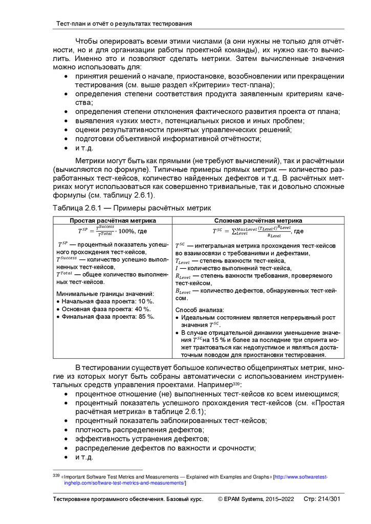 (вычисляются по формуле). Типичные примеры прямых метрик — количество разработанных тест-кейсов, количество найденных дефектов и т.д. В расчётных метриках могут использоваться как совершенно тривиальные, так и довольно сложные