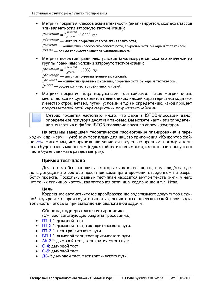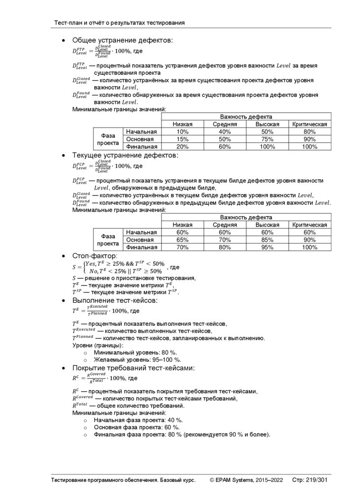 условий, при выполнении которых тестирование завершается. Наличие этого критерия страхует команду как от преждевременного прекращения тестирования, так и от продолжения тестирования в условиях,