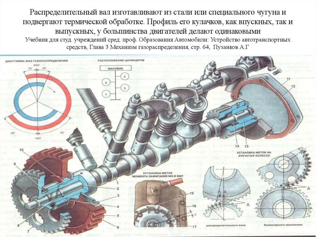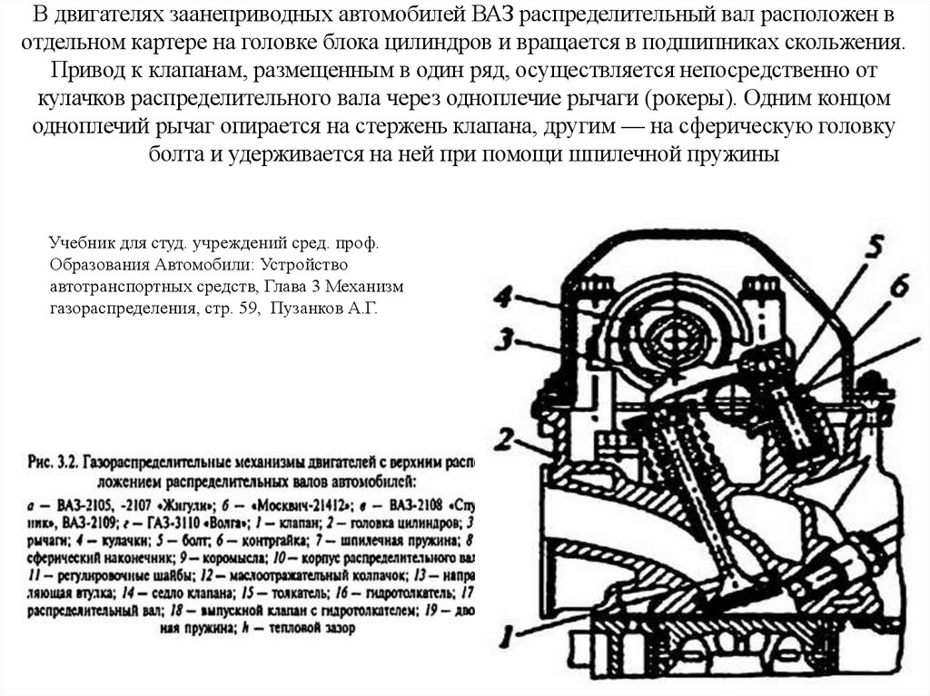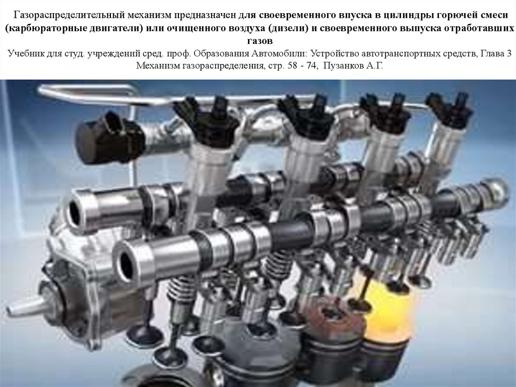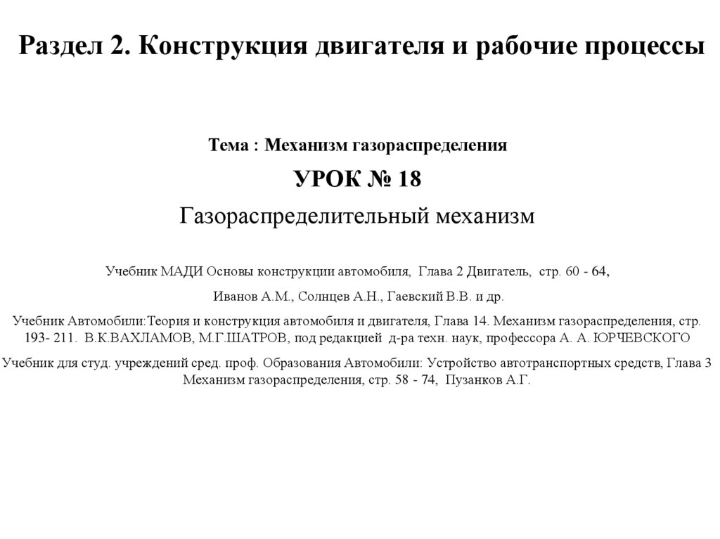 Учебник АВТОМОБИЛИ . Устройство автотранспортных средств А.Г. Пузанков ,Глава 3 Механизм газораспределения, стр. 58 – 75.
