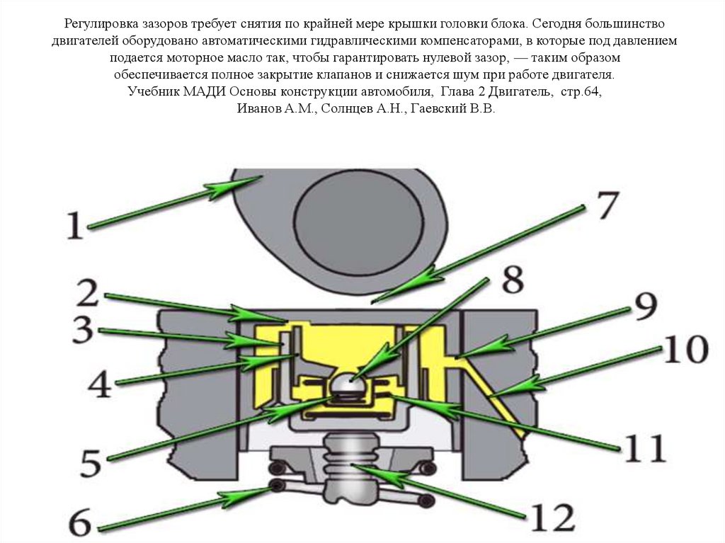 Регулировка зазоров требует снятия по крайней мере крышки головки блока. Сегодня большинстводвигателей оборудовано автоматическими гидравлическими компенсаторами, в которые под давлением