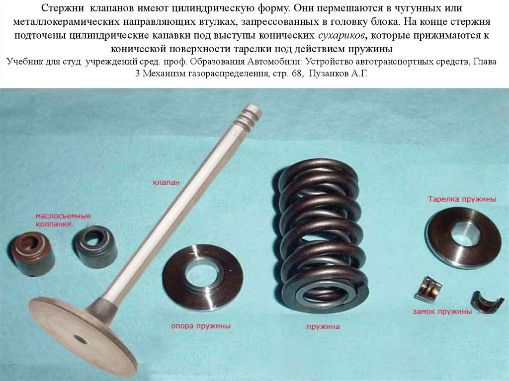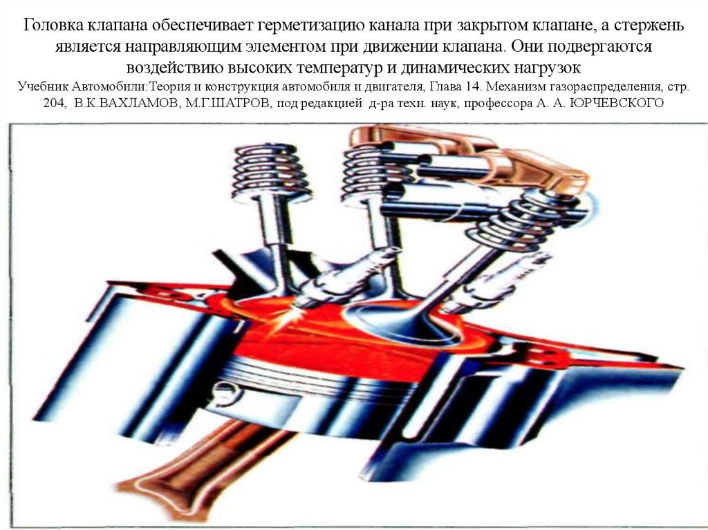Головка клапана обеспечивает герметизацию канала при закрытом клапане, а стерженьявляется направляющим элементом при движении клапана. Они подвергаются