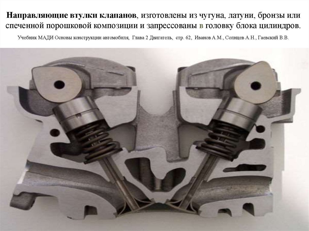 Стержни клапанов имеют цилиндрическую форму. Они пермешаются в чугунных илиметаллокерамических направляющих втулках, запрессованных в головку блока. На конце стержня