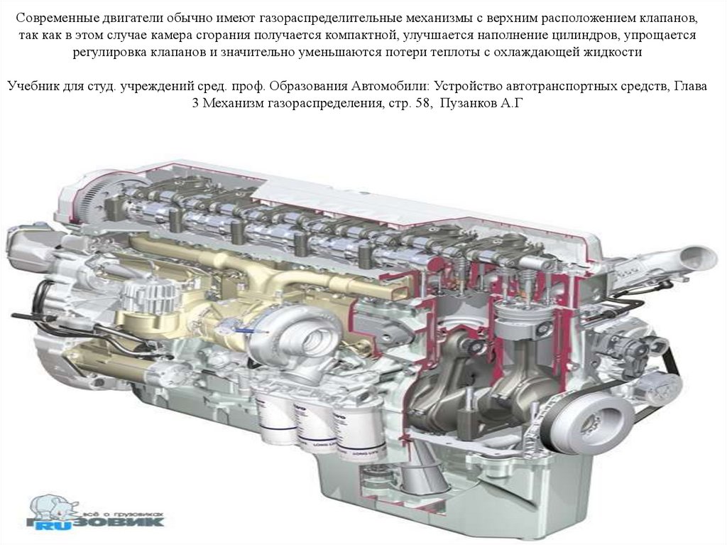 Современные двигатели обычно имеют газораспределительные механизмы с верхним расположением клапанов,так как в этом случае камера сгорания получается компактной, улучшается наполнение цилиндров, упрощается