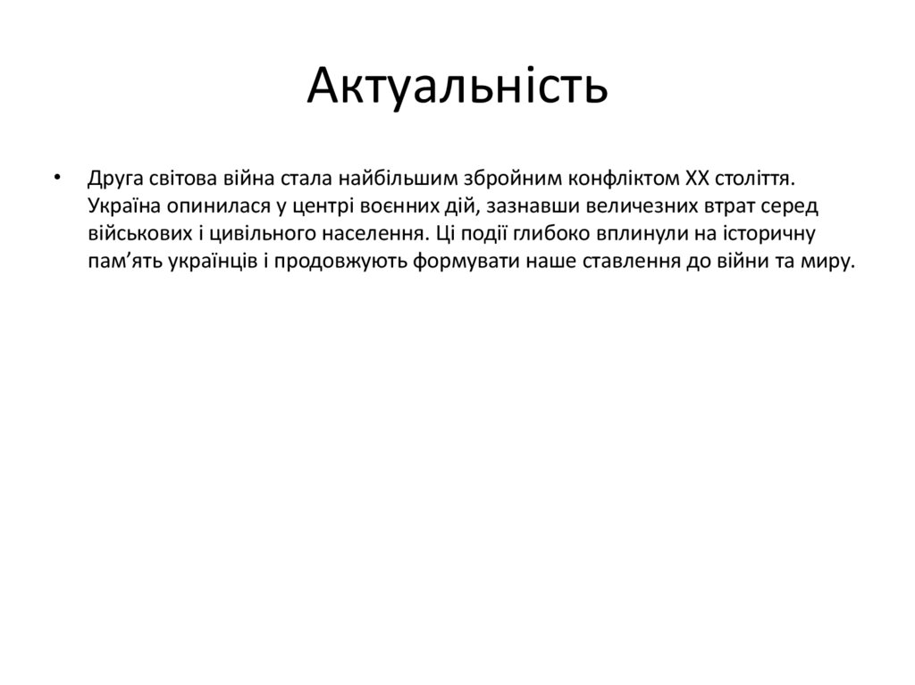 АктуальністьДруга світова війна стала найбільшим збройним конфліктом ХХ століття.