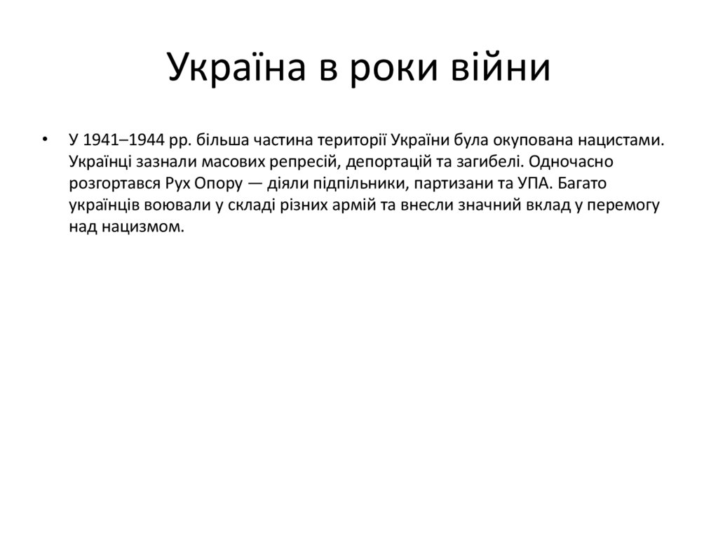 Україна в роки війниУ 1941–1944 рр. більша частина території України була окупована нацистами.