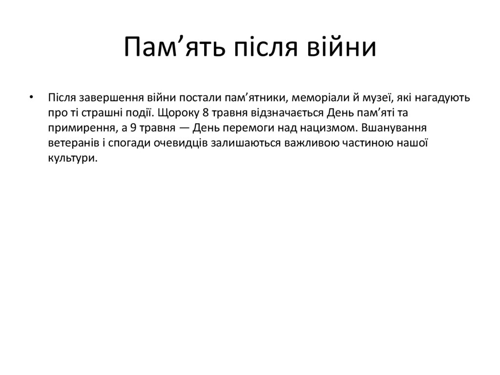 Пам’ять після війниПісля завершення війни постали пам’ятники, меморіали й музеї, які нагадують