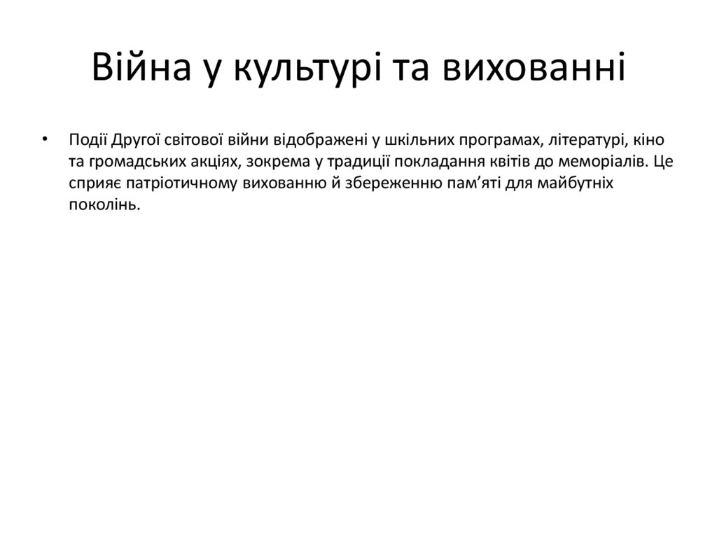 Війна у культурі та вихованніПодії Другої світової війни відображені у шкільних програмах, літературі, кіно