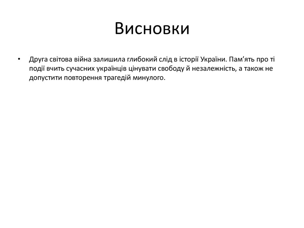 ВисновкиДруга світова війна залишила глибокий слід в історії України. Пам’ять про ті