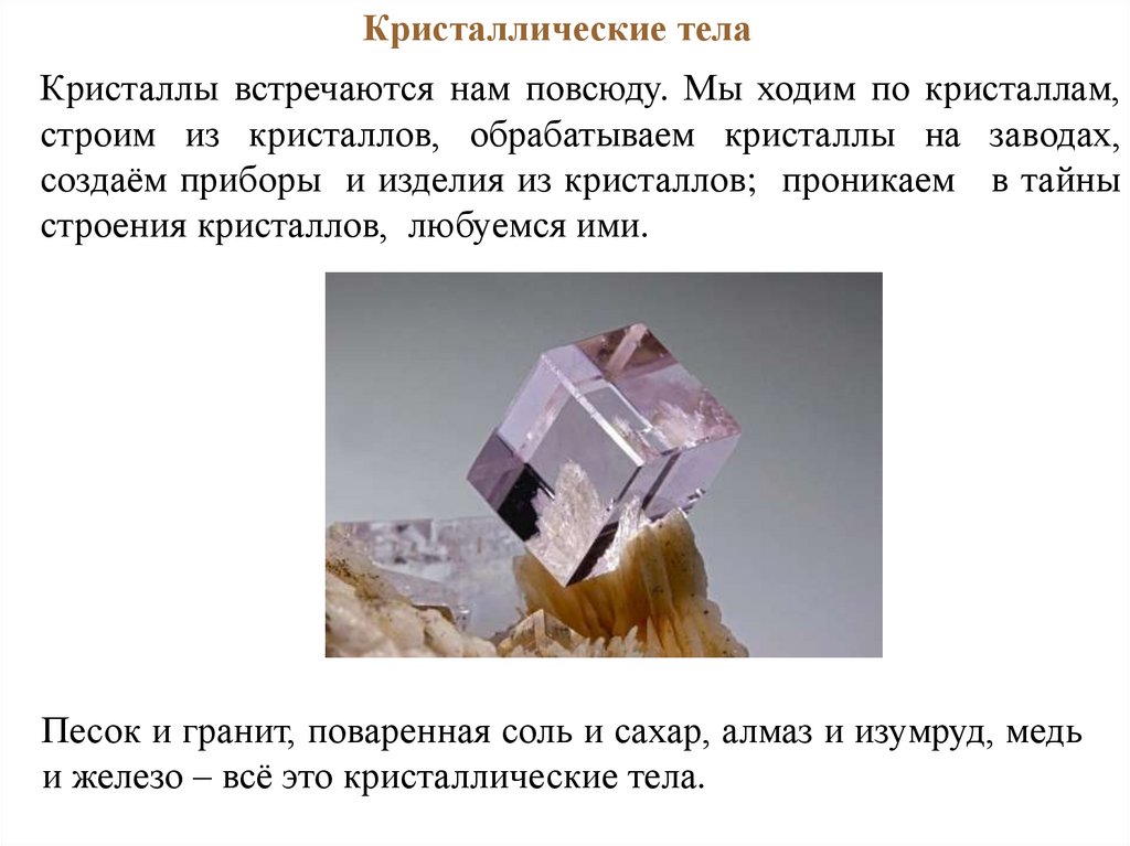 Кристаллические телаКристаллы встречаются нам повсюду. Мы ходим по кристаллам,