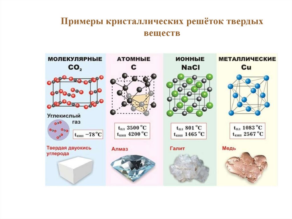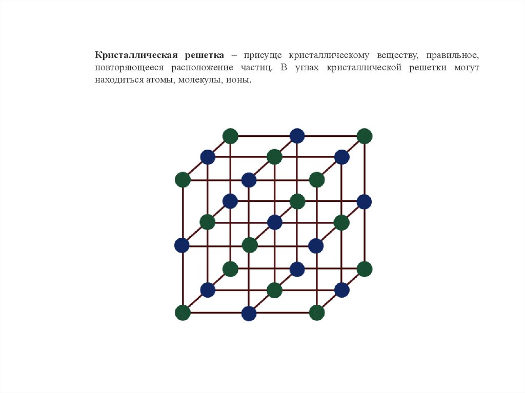 Кристаллическая решетка – присуще кристаллическому веществу, правильное,повторяющееся расположение частиц. В углах кристаллической решетки могут