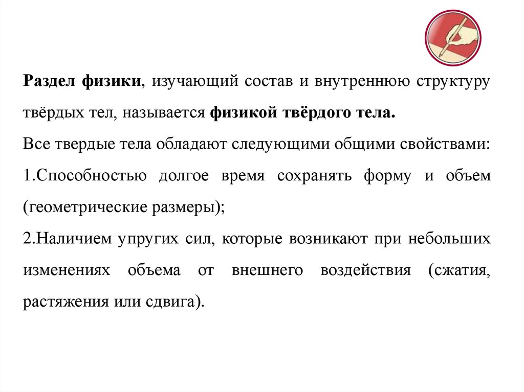 Раздел физики, изучающий состав и внутреннюю структурутвёрдых тел, называется физикой твёрдого тела.