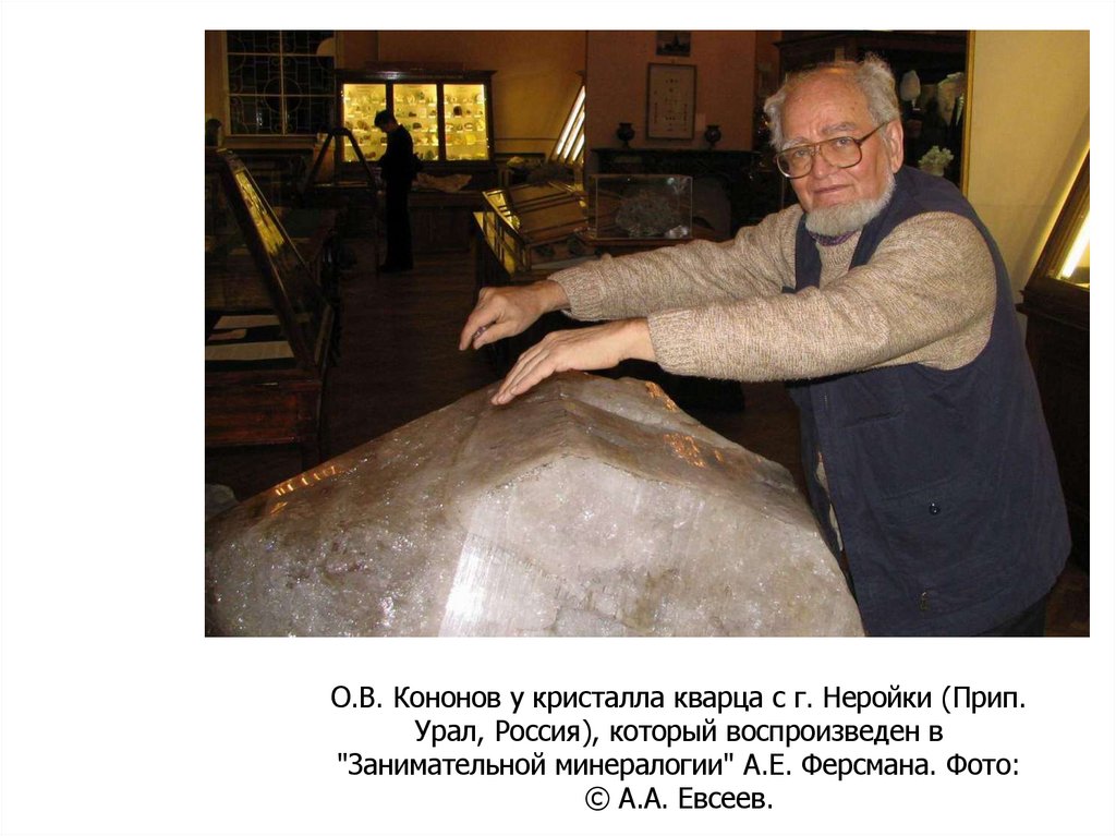 О.В. Кононов у кристалла кварца с г. Неройки (Прип.Урал, Россия), который воспроизведен в