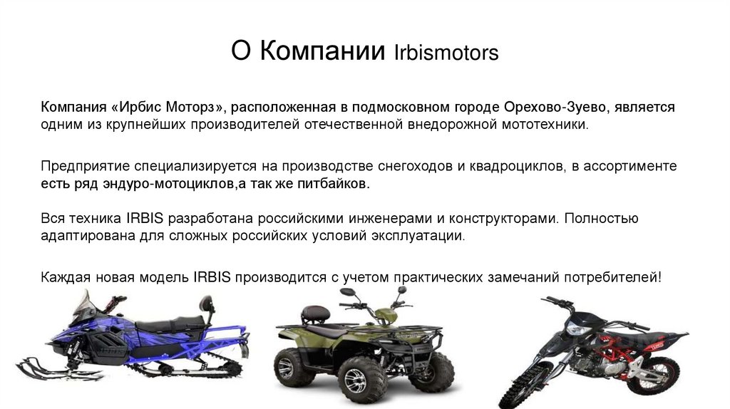 О Компании IrbismotorsКомпания «Ирбис Моторз», расположенная в подмосковном городе Орехово-Зуево, является