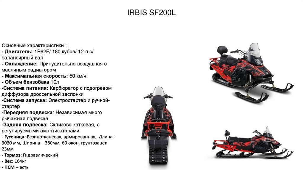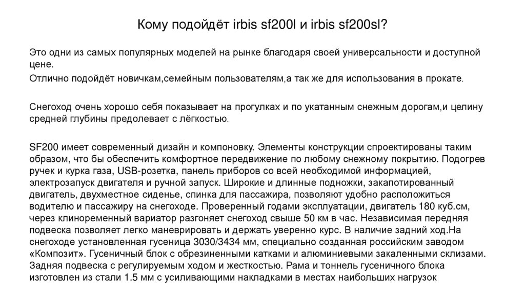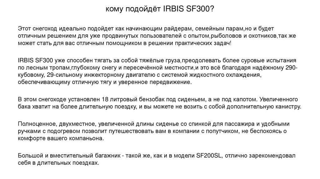 кому подойдёт IRBIS SF300?Этот снегоход идеально подойдет как начинающим райдерам, семейным парам,но и будет