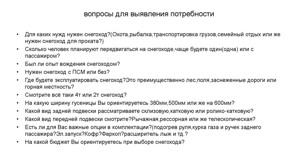 вопросы для выявления потребностиДля каких нужд нужен снегоход?(Охота,рыбалка,транспортировка грузов,семейный отдых или же