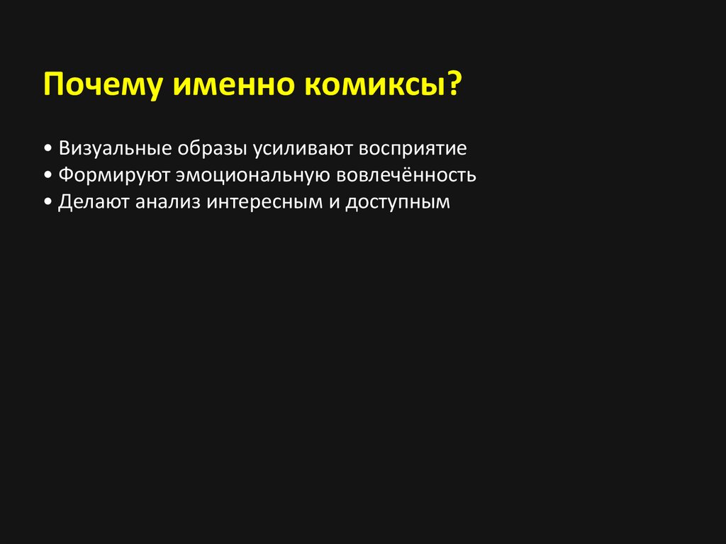 Почему именно комиксы?• Визуальные образы усиливают восприятие