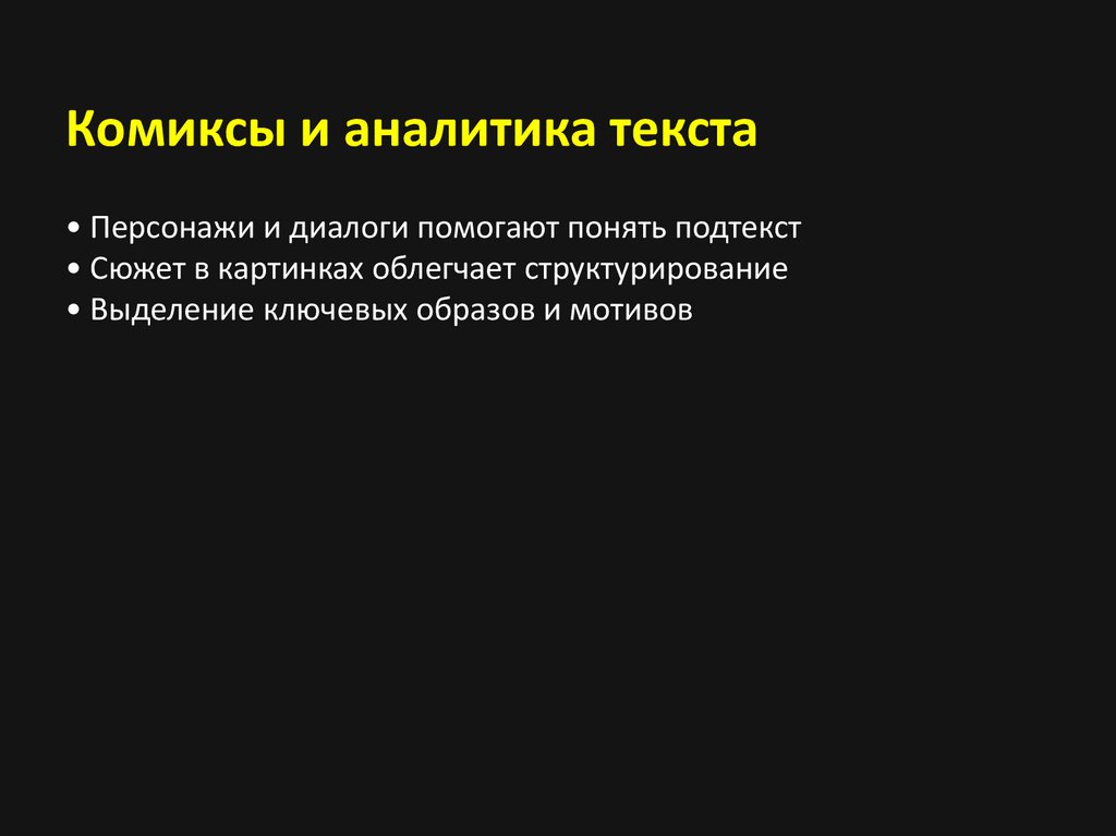 Комиксы и аналитика текста• Персонажи и диалоги помогают понять подтекст