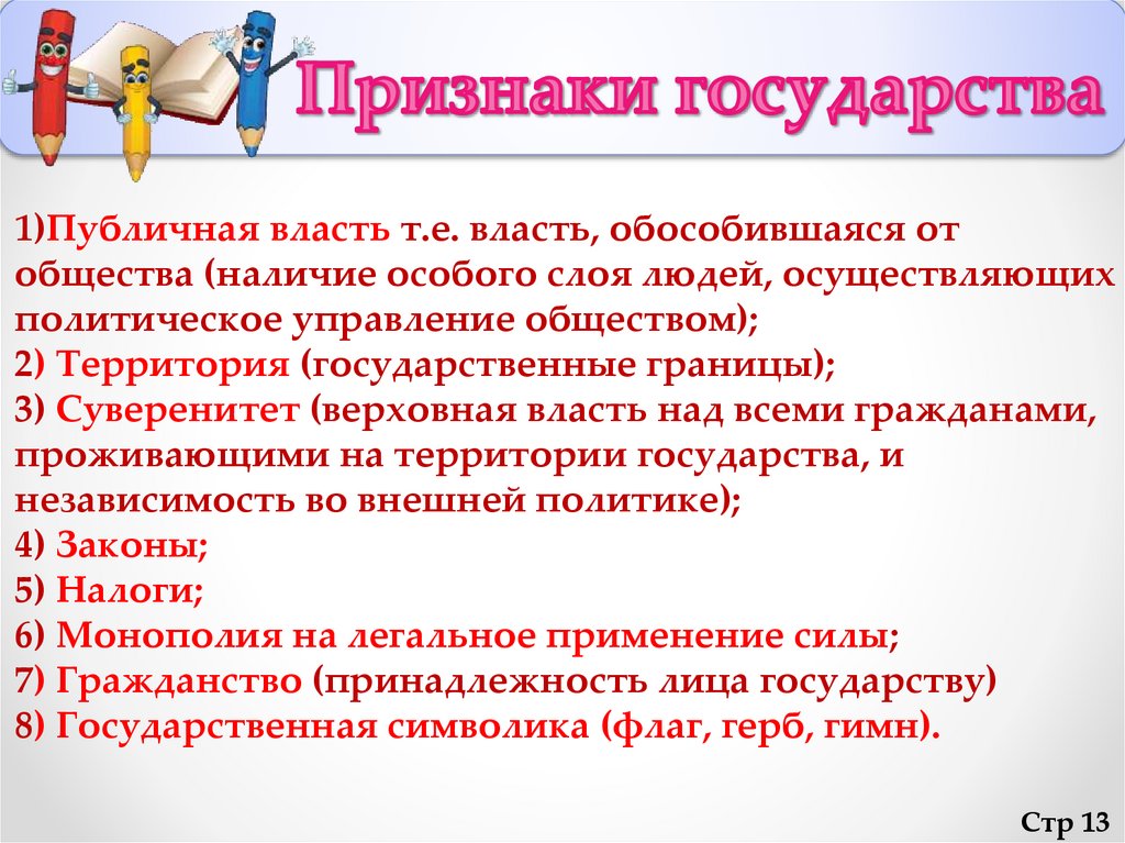 1)Публичная власть т.е. власть, обособившаяся отобщества (наличие особого слоя людей, осуществляющих