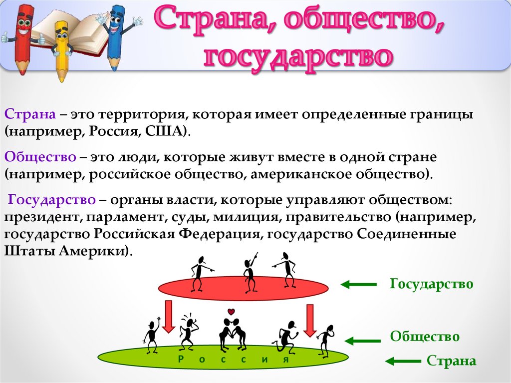 Страна – это территория, которая имеет определенные границы(например, Россия, США).