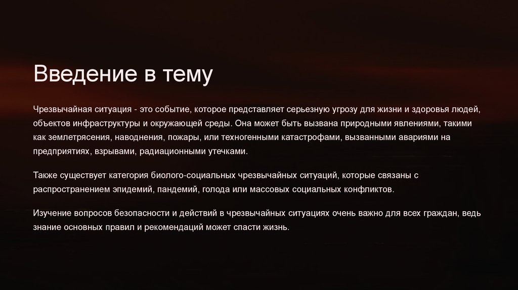 Введение в темуЧрезвычайная ситуация - это событие, которое представляет серьезную угрозу для жизни и здоровья людей,