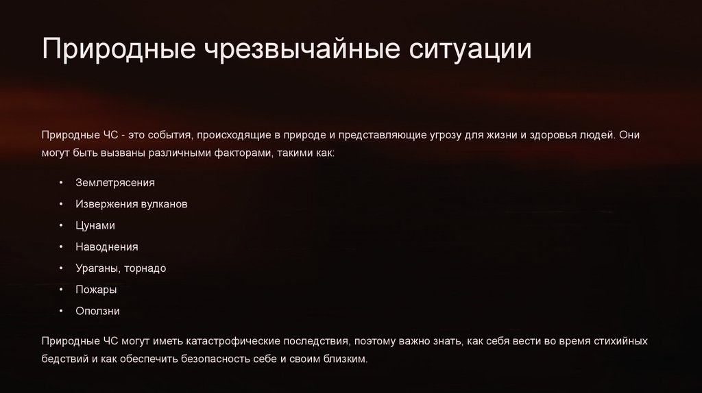 Природные чрезвычайные ситуацииПриродные ЧС - это события, происходящие в природе и представляющие угрозу для жизни и здоровья людей. Они