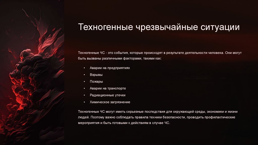 Техногенные чрезвычайные ситуацииТехногенные ЧС - это события, которые происходят в результате деятельности человека. Они могут