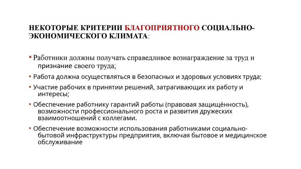 НЕКОТОРЫЕ КРИТЕРИИ БЛАГОПРИЯТНОГО СОЦИАЛЬНОЭКОНОМИЧЕСКОГО КЛИМАТА:§ Работники должны получать справедливое вознаграждение за труд и