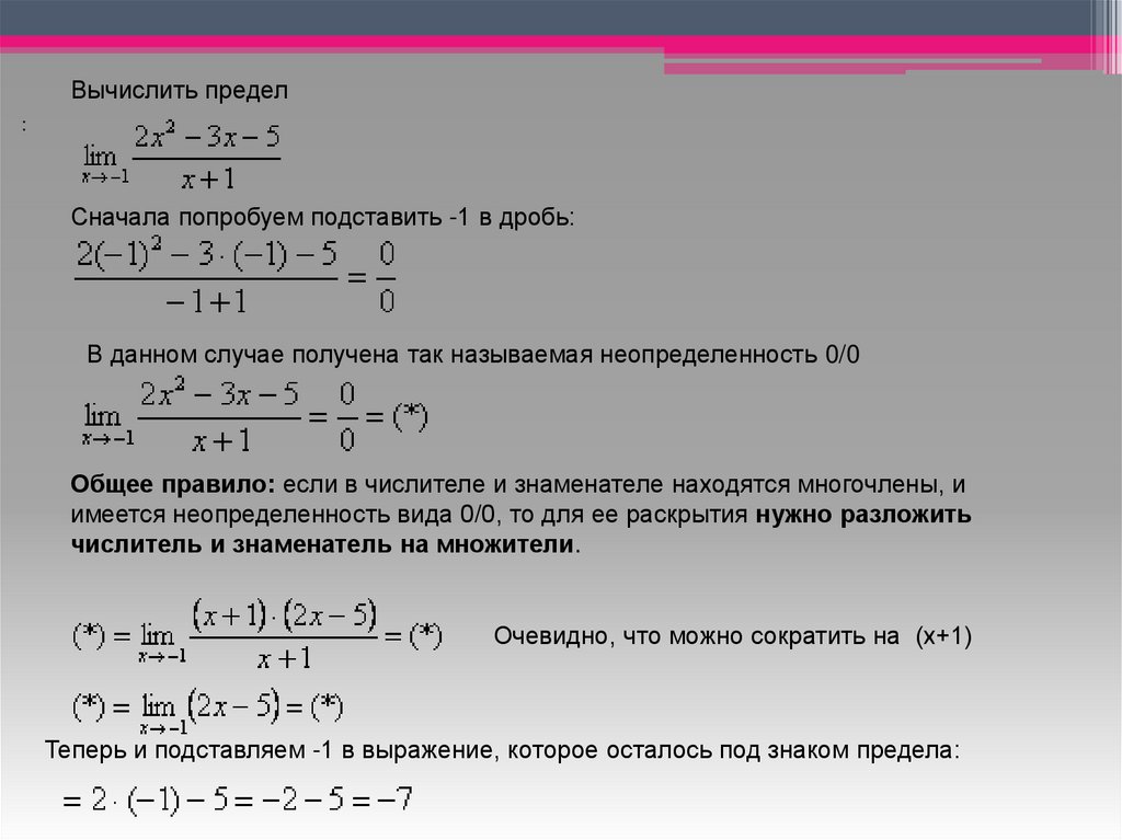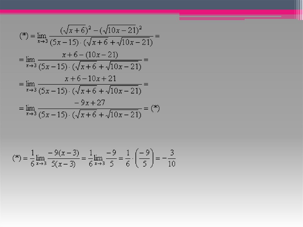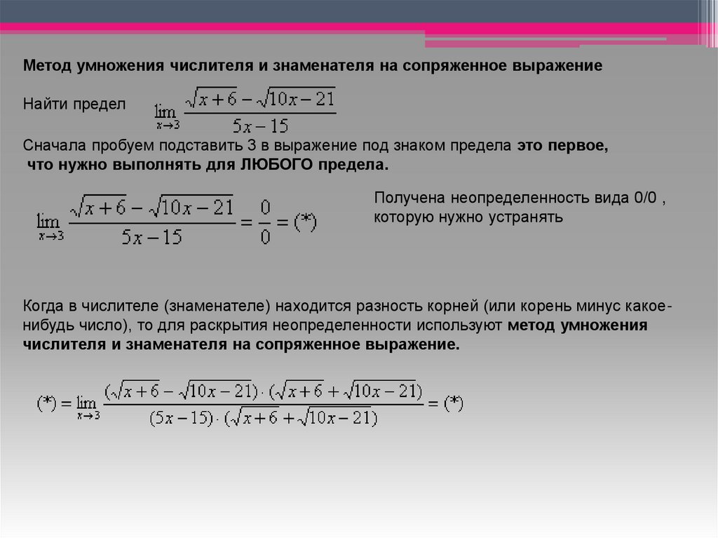Когда в числителе (знаменателе) находится разность корней (или корень минус какоенибудь число), то для раскрытия неопределенности используют метод умножения