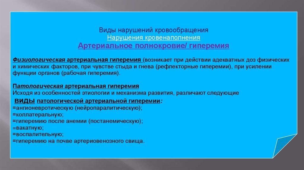 11. Виды нарушений кровообращения Нарушения кровенаполнения Артериальное полнокровие/ гиперемия