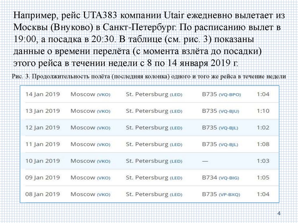 Например, рейс UTA383 компании Utair ежедневно вылетает изМосквы (Внуково) в Санкт-Петербург. По расписанию вылет в