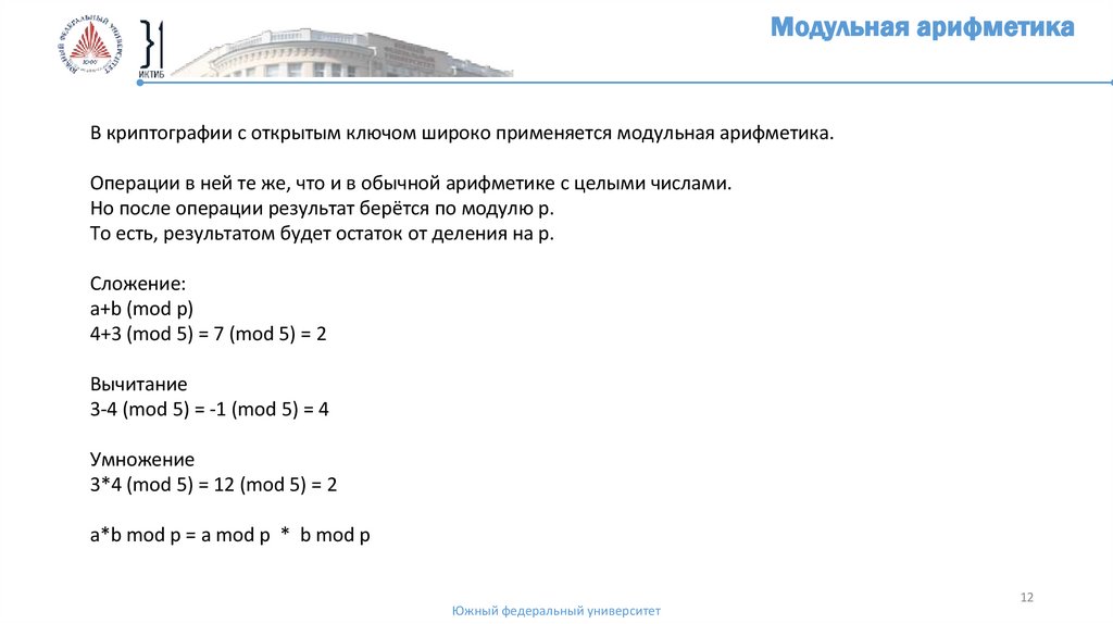 Модульная арифметикаВ криптографии с открытым ключом широко применяется модульная арифметика.