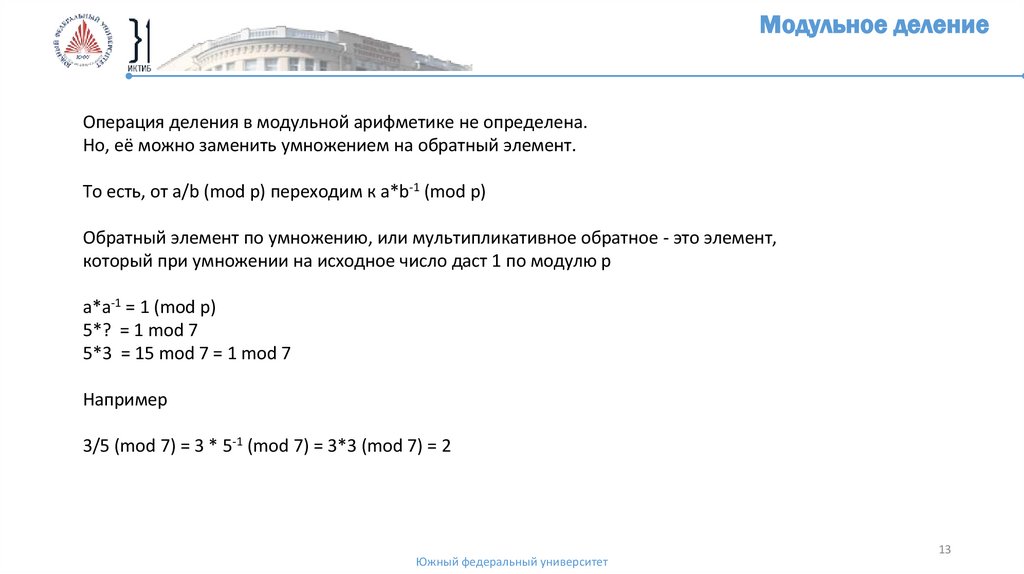 Модульное делениеОперация деления в модульной арифметике не определена.
